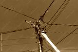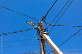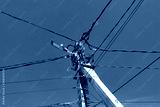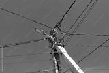 A concrete electric pole with a street lamp and lots of wires against a blue sky
