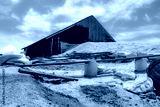 Barn with brine salt in sack. Pile of organic sea salt and bamboo basket in front of barn with blue sky and white clouds in summer. Raw material of salt industrial. Ocean salt in plastic sack.
