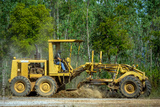 Motor grader clearing and leveling construction site surface with forest in the background. Grader industrial machine on road construction work.