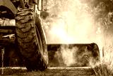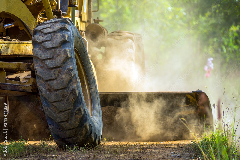 Close up of Motor grader clearing and leveling construction site surface. Grader industrial machine on road construction work.