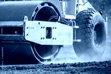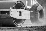 Close up of vibratory roller compactor working on construction site. Compaction machine on road construction work, earthwork. Heavy-duty machinery working on highway construction site.