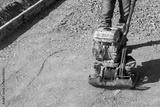 Worker is compacting soil by vibratory plate compactor. Construction equipment. Smooth compaction tool.