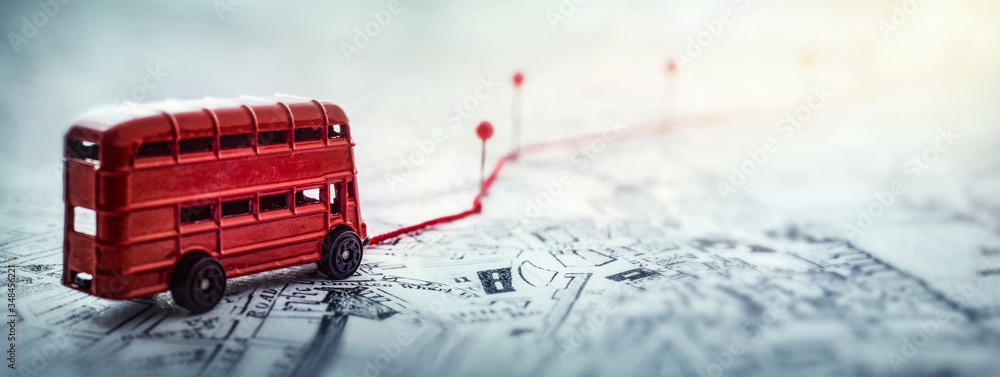 Red bus, pins and route laid on a map of the city. Concept on the adventure, discovery, navigation, communication, logistics, geography, transport and travel topics.