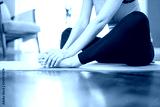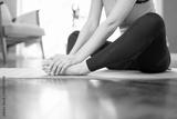 Yoga in living room - Sporty woman stretching legs on exercise mat