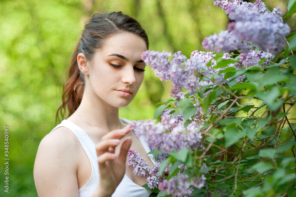 beautiful woman portrait with lilac flowers. purple flowering garden, spring