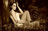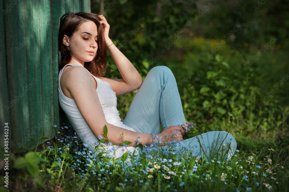 young girl sitting in the spring garden between flowers, on a background of old boards, lights and shadows