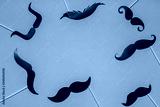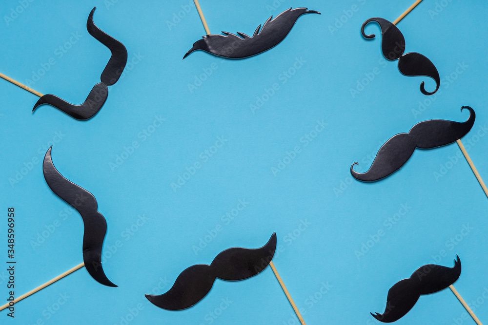 Various black photo booth props moustaches of different shape on blue background. Greeting card for father's day or men's health awareness month campaign concept. Flat lay, space for text, mock up
