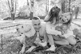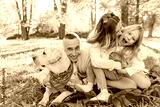 Happy beautiful family with dog labrador is having fun are sitting on green grass in park.