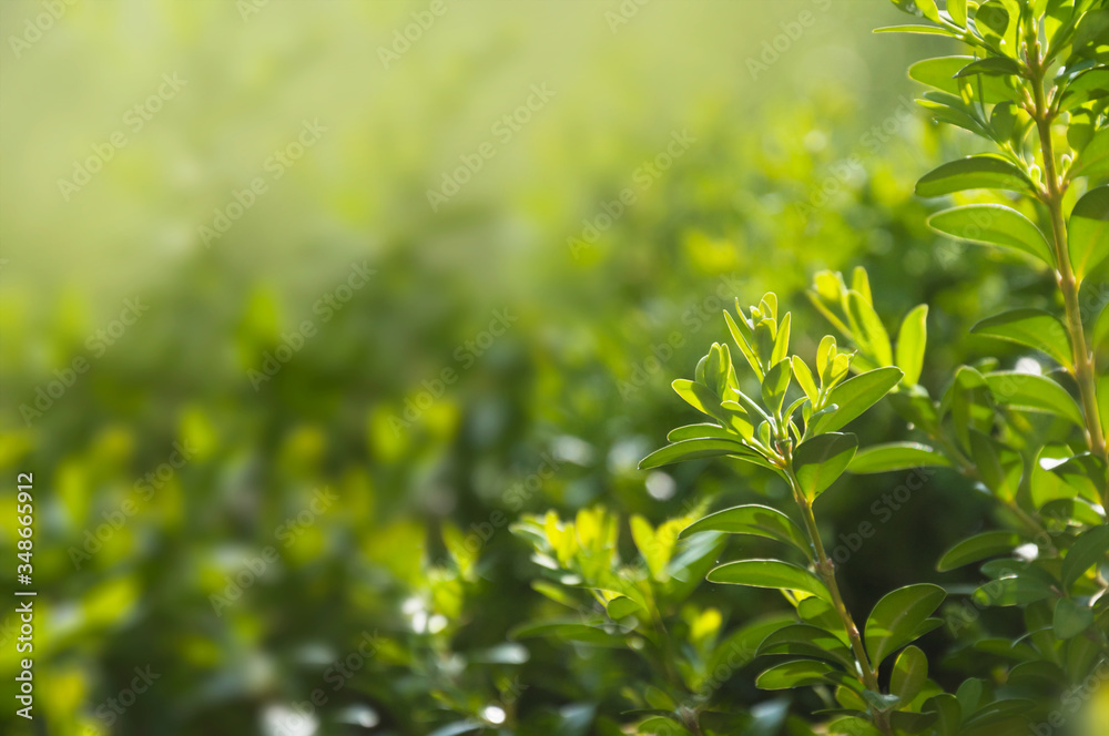 Closeup nature view of blurred green leaves with sun flare and winds in the background. Green natural texture. Space for text.
