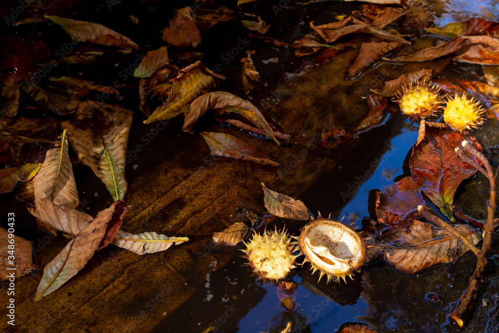 Cracked chestnuts and leaves in a puddle on the road at sunset. Contrasting shadows.