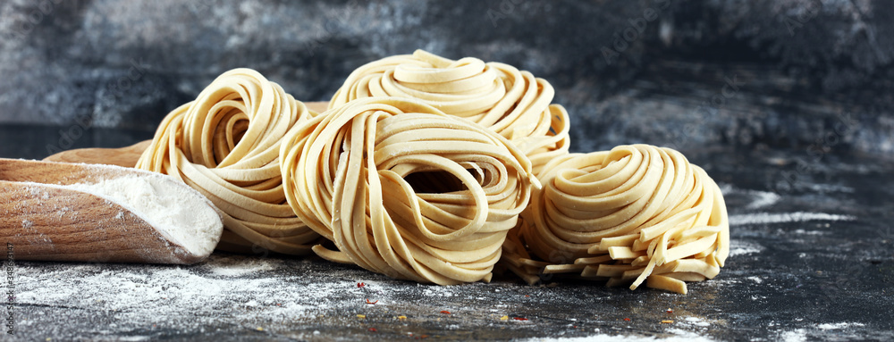 Closeup of raw homemade pasta. fresh italian traditional raw fresh pasta