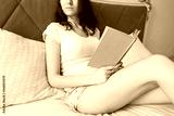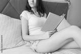 Attractive young brunette woman sits in the morning in her bed and reads a book
