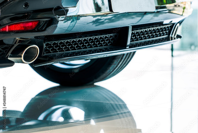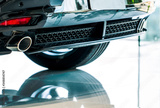 Closeup detail exhaust pipe of car that parked in showroom with reflection. Unique pattern of car exhaust pipe. Accessories for sports car. Exhaust pipe of gasoline engine car. Automobile rear grille.