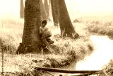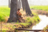 Fishing boy asian farmer people on rice green field during morning time.