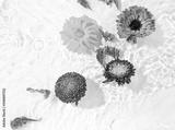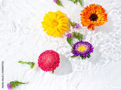 Colorful aster and calendula flowers swim in the water. Beautiful spa concept background. Top view