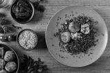 Lentil and millet meatballs. Served on tomato salsa with buckwheat. Gray plate, wooden boards in the background. Top view.