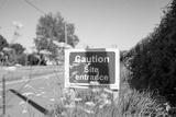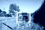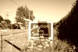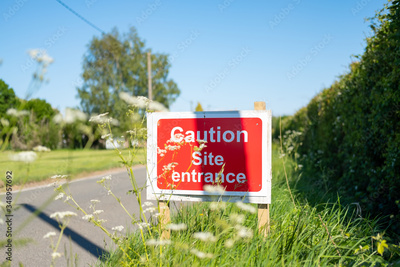 Makeshift Site Entrance sign seen located on a grassy verge, near a village. The sign is used to warn drivers of heavy plant vehicles in the area.