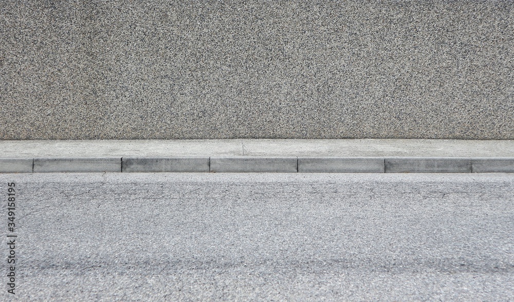 Concrete sidewalk, a wall made of cement and little pebbles, and a paved road in front, Background for copy space