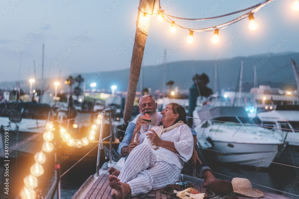 Senior couple cheering with champagne and eating watermelon on boat - Old people having fun together in summer vacation - Joyful elderly lifestyle, travel and love concept - Soft focus on faces