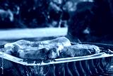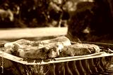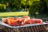 Close-up of freshly made burgers and chops seen on a small BBQ in a large garden during early summer.