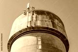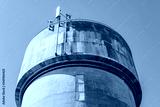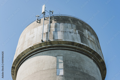 Heavily weathered, cast concrete water tower seen against a clear blue sky. Newly installed 5G telecom masts can be seen atop the tower, undergoing testing.