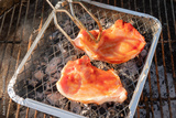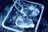 Freshly prepared pork chops in marinated sauce seen being laid on a disposable barbecue.