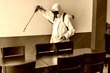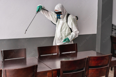 Worker in hazmat suit wearing face mask protection while making disinfection inside bar restaurant - Coronavirus decontamination for people health - Focus on face