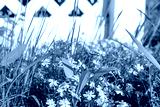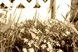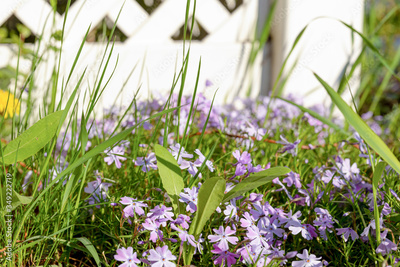 Dandelion weed among a flowers Phlox subulata on the lawn near a white plastic fence in a typical cottage village. Image for design on the theme of gardening, landscaping