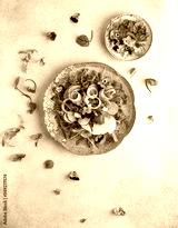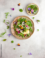 Delicious summer salad with edible flowers, vegetables, fruit, microgreens and cheese. Clean and healthy eating concept. Top view.