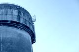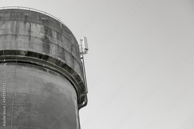 Detailed view of a large cast-concrete water tower, showing its weathering. A newly installed 5G mast can be seen atop the tower.
