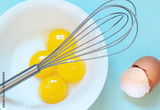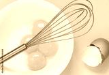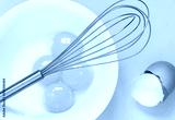 The whisk over fresh raw chicken yolks, eggs shells on the blue background. Baking or food preparation concept close up.