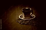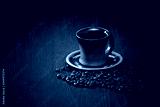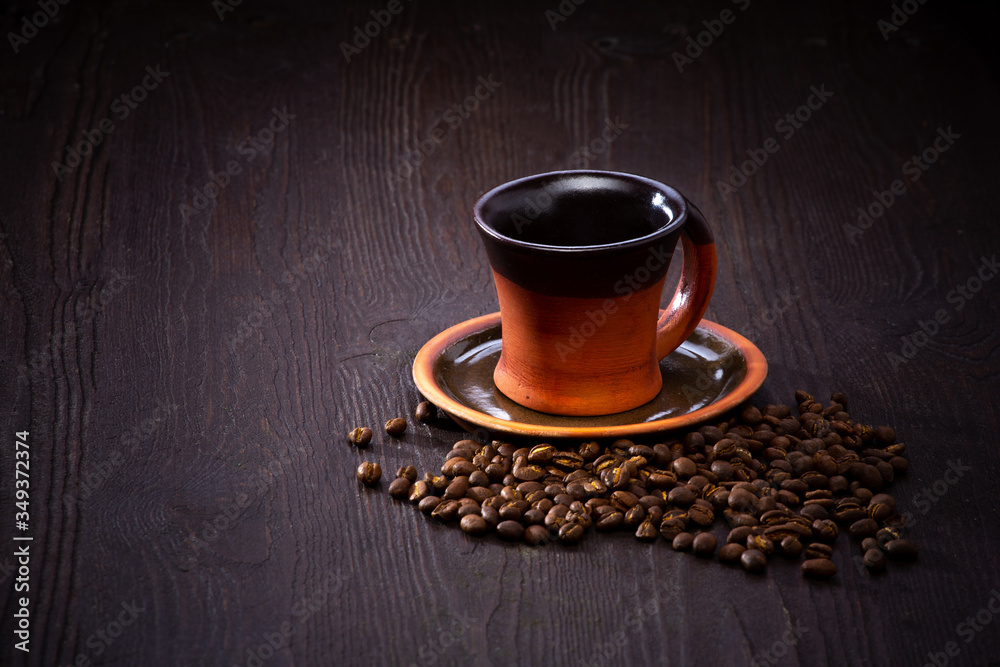 Brown clay coffee cup and saucer on a dark background with coffee beans.