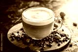 Aromatic delicious latte in a transparent Cup on a brown wooden tray. There are coffee beans and nuts nearby. Breakfast or a coffee break in a cozy cafe