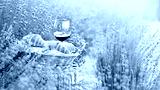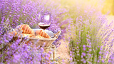 Wine and croissant against lavender landscape in sunset rays. Harvesting of aromatic lavender. A basket filled with fresh food stands at midlle of lavender field.