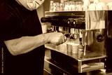 A worker preparing coffee with mask and gloves. Not recognizable people.