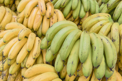 Organic green and natural ripening banana bunches at fruit stand in Geylang, Singapore