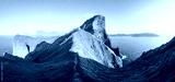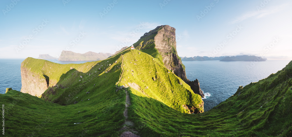 Panorama of green faroese hills and Kallur lighthouse on Kalsoy island, Faroe islands, Denmark. Landscape photography