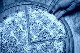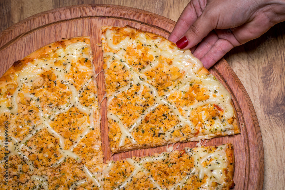 hand holding chicken pizza with Catupiry cheese,in Brazil it is called chicken pizza with catupiry cheese