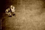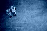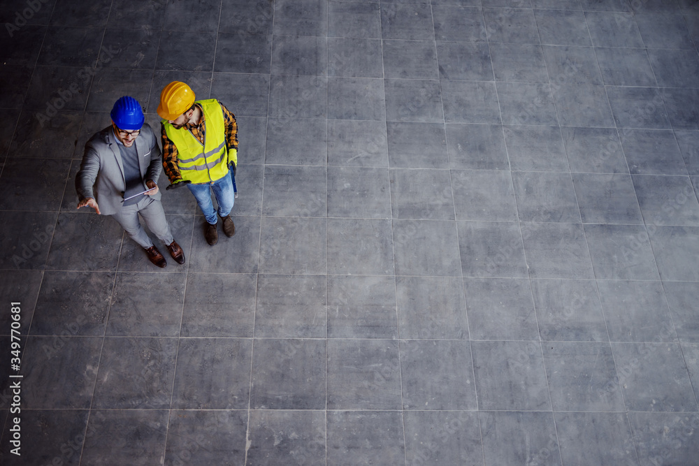 Top view of supervisor with helmet on head in suit standing with construction worker, holding tablet and explaining him ideas about project.