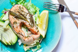 Slice of salmon fish baked in an oven with green salad and avocado. Healthy food close up