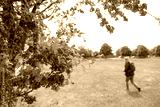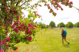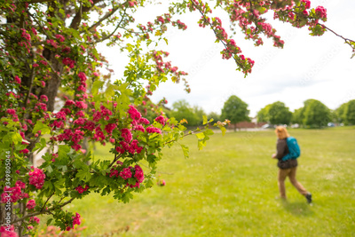 Member of the public seen walking in a public park, framed by free red flowers. The woman is seen wearing a day sack.