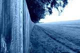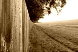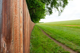 Deep focus of a newly installed timber fence extending to the far distance, newly creosoted. A sandy footpath is seen extending on the hillside.