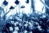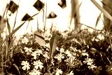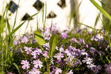 Dandelion weed among a flowers Phlox subulata on the lawn near a white plastic fence in a typical cottage village. Image for design on the theme of gardening, landscaping