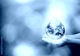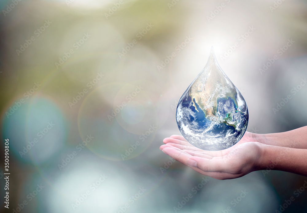 world day for water. earth drop on hand and sun rise morning.hands wait for the world in water droplet shape on green bokeh background.Elements of this image furnished by NASA.
