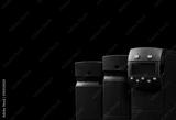 Frequency inverter. Three inverter controller set isolated on black background. Power inverter with run and stop button in green and red. Inverter controller drive. Industrial hardware. Power supply.
