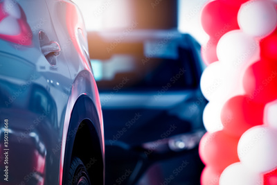 Selective focus SUV car parked in modern showroom. Car dealership concept. Automotive industry. Auto leasing business. Blurred showroom decor with red and white ballons for promotions and events.