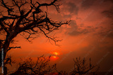 Beautiful silhouette leafless tree and sunset sky beside the sea. Romantic and peaceful scene of sea, sun, and sky at sunset time with beauty pattern of branches. Beauty in nature. Evening background.