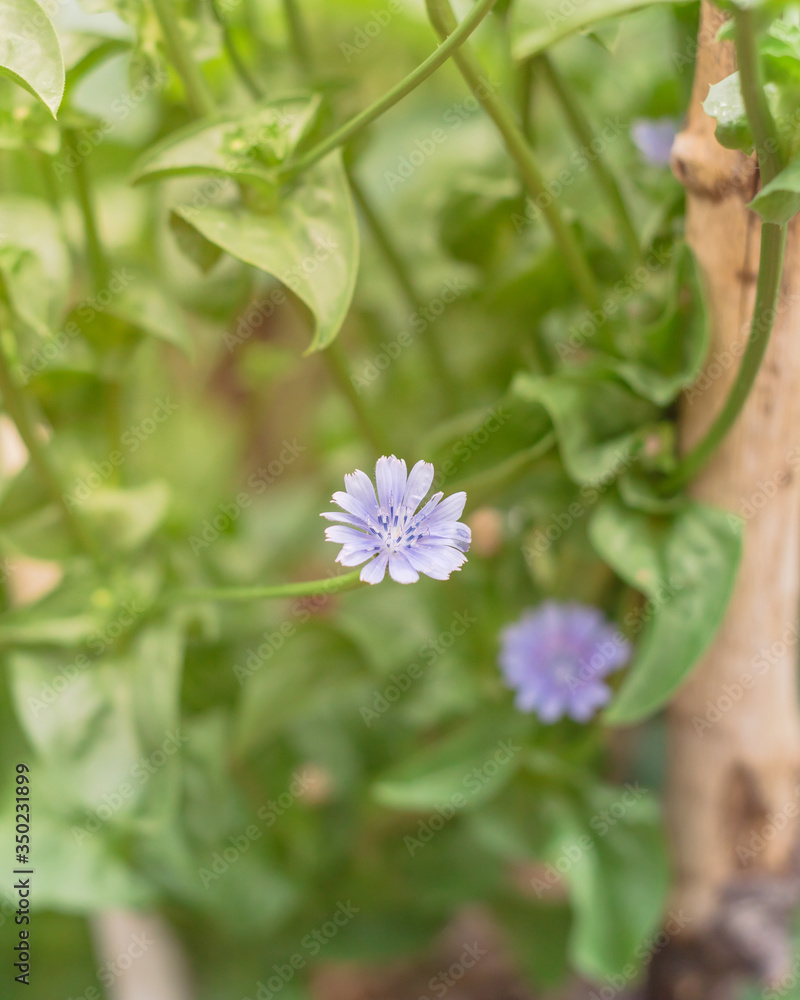 Blooming endive or chicory flower at vegetable garden near Dallas, Texas, USA