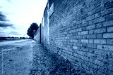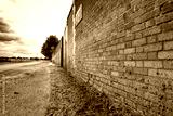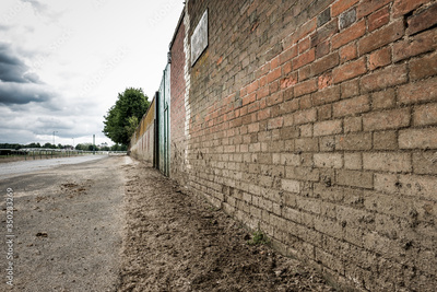 Rough textured surface of a weathered brick wall, showing the dried mud on the lower half of the wall and adjacent roadway.