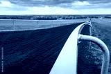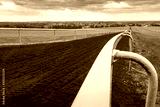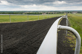 Deep depth of field of white track barriers seen extending to the far distance. The track is used for horse gallops, the track showing its soft texture.